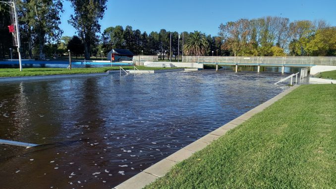 En la zona del Balneario Municipal se observa un importante caudal de agua, aunque el arroyo no se ha desbordado. El domingo se procedió a la apertura de las tres compuertas para facilitar el escurrimiento, además de realizar tareas de limpieza de restos de vegetación y otros elementos arrastrados por la corriente.